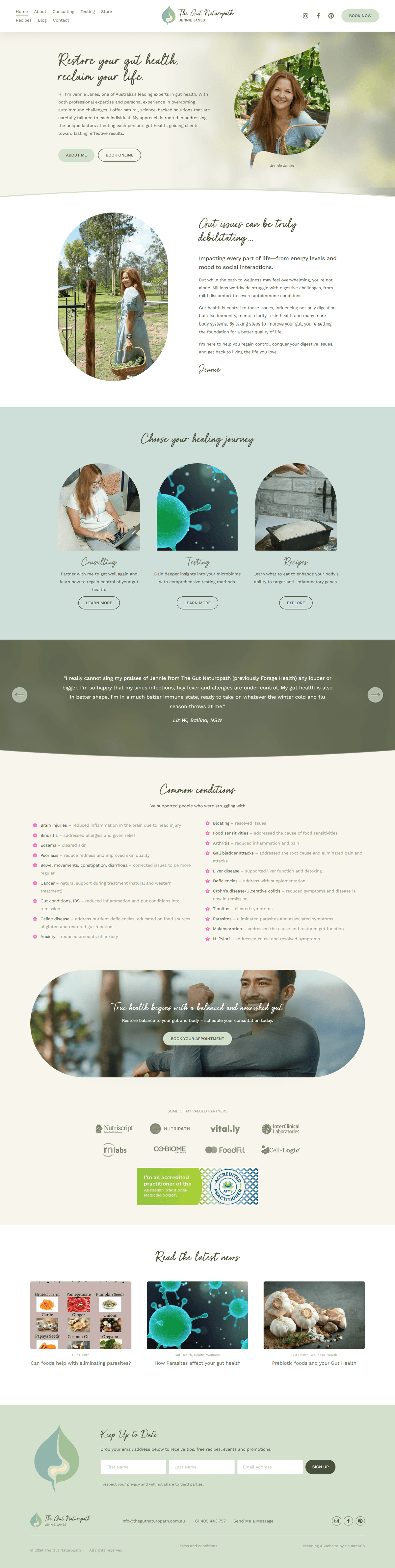 First, we created a warm, elegant and determined brand identity for The Gut Naturopath, that appeals to all genders and clearly conveys the nature of her work. Depicting a stomach in a curvy leaf, her logomark is sure to resonate with an audience looking for natural solutions to gut related challenges.
