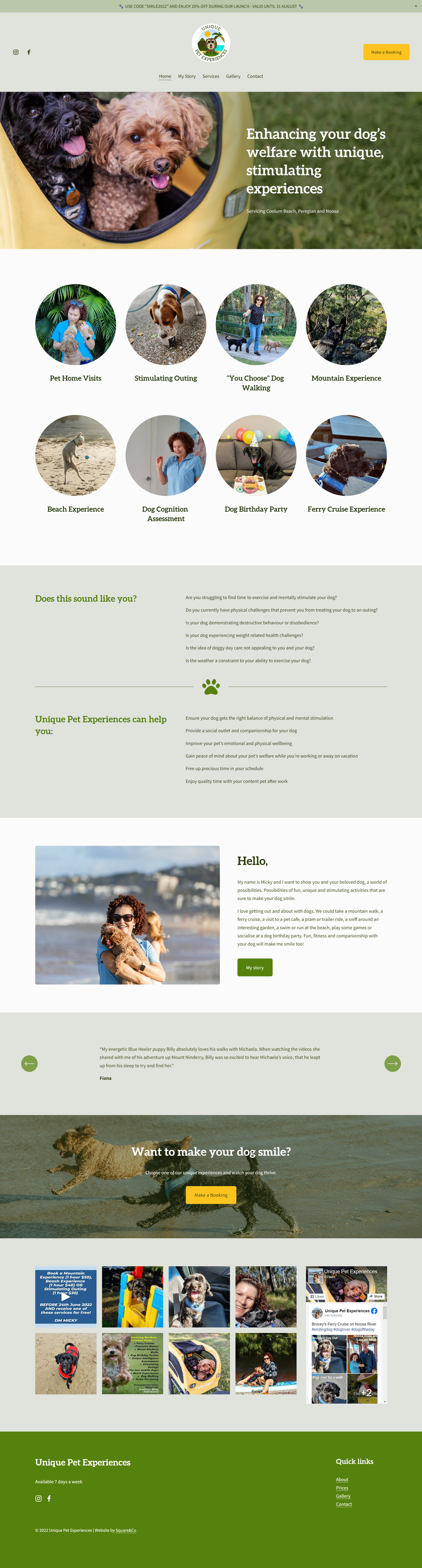 Michaela Ffitch, owner of Unique Pet Experiences, is a fun and caring dog professional on a mission to enhance the welfare of pets with unique, stimulating experiences. She offers one-on-one specialised care for dogs of all abilities and mobility on the Sunshine Coast, from Coolum Beach to Peregian and Noosa area.